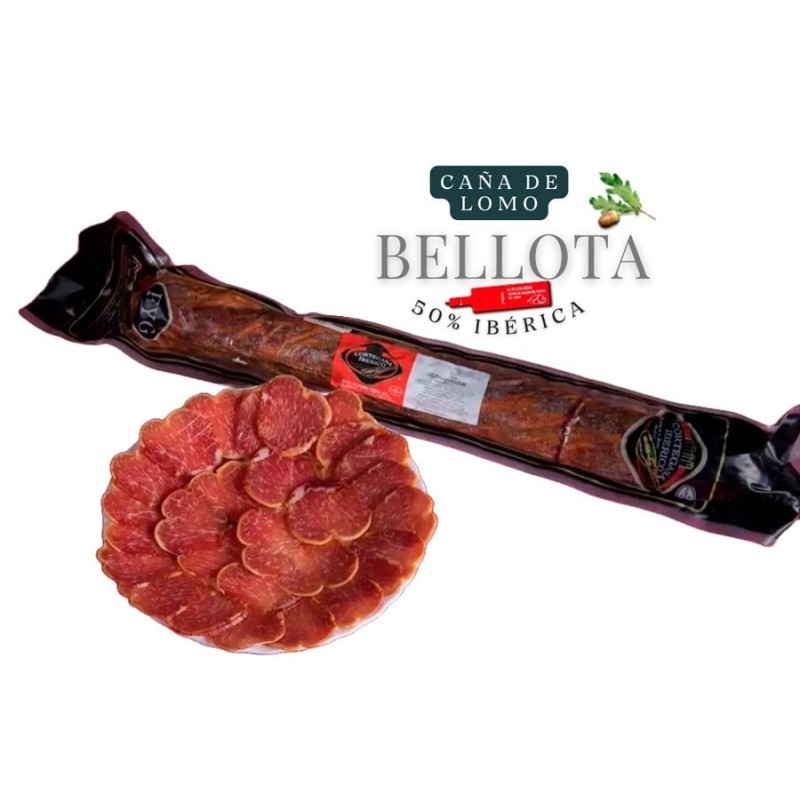 Ibérico Bellota 50% Set: Vorderschulter, Lende und Morcón. Große Auswahl von 4 Produkten, handwerklich hergestellt von Cortegana Ibérico. Es beinhaltet die Bellota 50% Ibérico Vorderschulter Rotes Etikett y la Bellota 50% Ibérico Lende, zusammen mit einem Ibérico Morcón und Salchichón. Ideal als Geschenk.