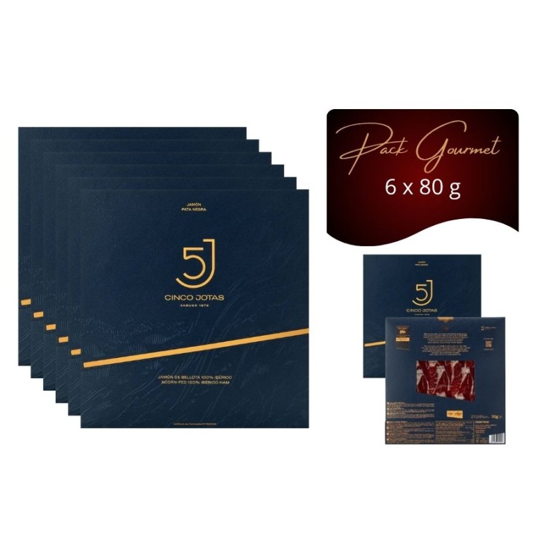 Der Geschnittene Schinken 5J (Cinco Jotas) ist der prestigeträchtigste Pata Negra 100% Ibérica Bellota aus Jabugo. Von Hand geschnitten und vakuumverpackt für höchste Qualität, erhältlich in praktischen Packungen mit 6, 12 oder 24 Beuteln, servierfertig.