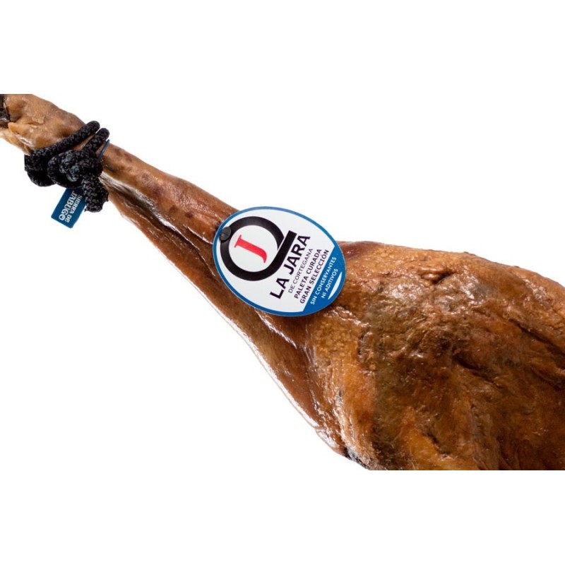 Der Vorderschinken Fuera de Norma Gran Selección von LA JARA, hergestellt in Jabugo, ist die ideale Wahl, um Spitzenqualität zu einem Preis zwischen Cebo de Campo und Bellota zu genießen. Diese Stück ist als Ganzes (ca. 5–6 kg) oder vom Messermeister von Hand geschnitten erhältlich.