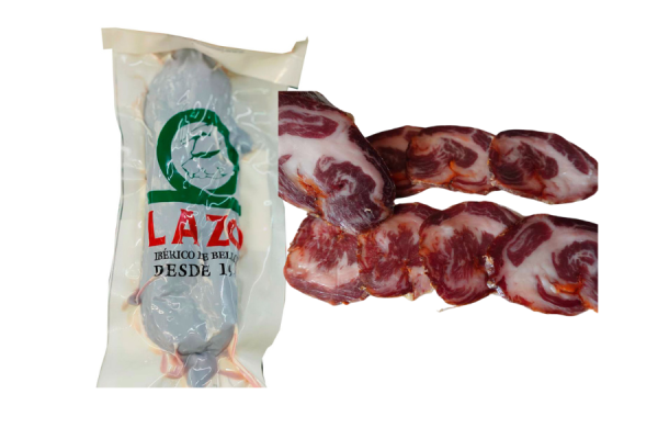 Die Caña de Lomo 100% Iberico de Bellota von LAZO (ca. 1 kg) ist eine Hommage an die DOP Jabugo Tradition. Dieses exquisite Stück stammt von 100% iberischen Schweinen, die freilaufend gehalten und während der Montanera mit Bellota gefüttert wurden. Handwerklich hergestellt und mit 90 Tagen Reifung in natürlichen Trockenräumen, zeichnet es sich durch seinen einzigartigen Geschmack und unvergleichliche Textur aus. Hauptzutaten: Schweinelende, Paprika, Dextrose, Knoblauch und Oregano. Erhältlich als ganzes Stück (1 kg) oder als Hälfte (500 gr).