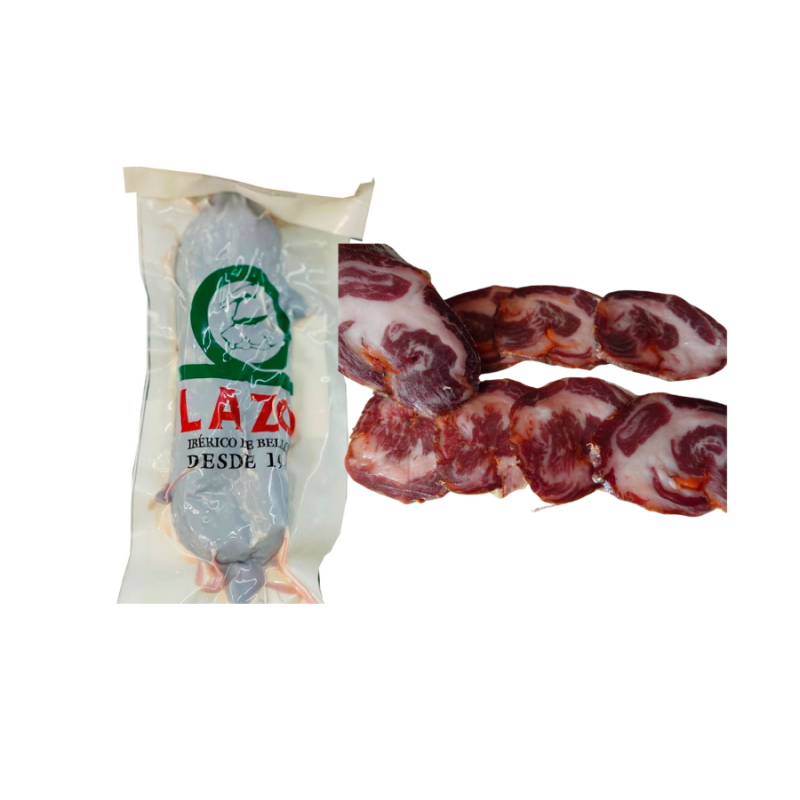 Die exquisite Coppa Iberico Bellota von LAZO (350/400gr) wird aus dem Iberico Cabecero gewonnen. Dieses handwerklich hergestellte Stück zeichnet sich durch seine unglaubliche Saftigkeit und einen höheren Fettgehalt aus, der ihm eine zarte Textur und einen tiefen, ausgewogenen Geschmack verleiht. Es stammt von iberischen Schweinen, die während der Montanera mit Bellota gefüttert wurden, was einen authentischen und hochwertigen Geschmack garantiert, ideal für einen Gourmet-Aperitif.