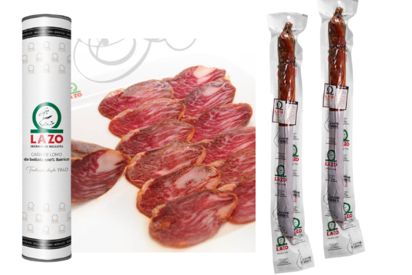 The Caña de Lomo 100% Ibérica de Bellota from LAZO (1 kg approx.) is a tribute to the DOP Jabugo tradition. This exquisite piece comes from 100% Iberian pigs raised free-range and fed with Bellota during the Montanera period. Artisanally elaborated with 90 days of curing in natural drying rooms, it stands out for its unique flavor and unrivaled texture. Main ingredients: Pork loin, paprika, dextrose, garlic, and oregano. Available in whole piece (1 kg) or half (500 gr).