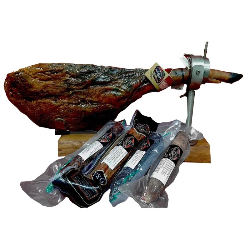 Cebo Ham Set: 5-Piece Gourmet Assortment. Gourmet assortment of Iberian products in a gift case. Includes a Cebo Iberian Ham 50% (8-8.5 Kg) and a Bellota 100% Iberian Loin, along with three Iberian cold cuts. Products artisanally crafted in Cortegana with Jabugo quality.
