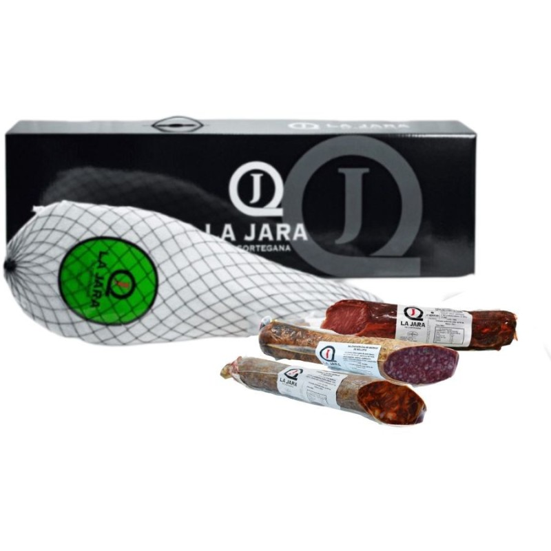 LA JARA Iberian Set: Shoulder and Cold Cuts Cebo de Campo and Bellota. This exclusive set from LA JARA consists of 4 selected pieces. It includes the 50% Iberian Cebo de Campo Shoulder and an assortment of exquisite Bellota Cular Cold Cuts, perfect for enjoying with family or as a gift. All presented in an elegant gift case.