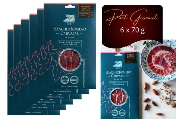 The Sliced Sánchez Romero Carvajal Shoulder is a true delicacy in fine marbled slices, hand-cut and vacuum-packed. Pata Negra from Jabugo, 100% Ibérica Bellota, available in convenient 70 g packs (6, 12 or 24 sachets), ready to enjoy.