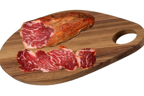 L'exquise Coppa Ibérique Bellota de LAZO (350/400gr) est obtenue à partir du Cabecero Ibérique. Cette pièce élaborée artisanalement se distingue par son incroyable jutosité et sa teneur en graisse plus élevée qui lui confère une texture tendre et une saveur profonde et équilibrée. Elle provient de porcs ibériques nourris avec des Bellota en montanera, assurant un goût authentique et de haute qualité, idéal pour un apéritif gourmet.