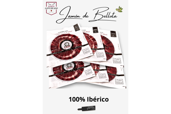Le Bellota 100% Ibérico Tranché LAZO est disponible en jambon et épaule, un tranché Pata Negra aux fines tranches, à la graisse infiltrée exquise et au goût du meilleur ibérique de Jabugo. Qualité certifiée Brida Negra, coupé au couteau et conditionné sous vide en sachets de 100 g et en packs (6, 9 ou 12).