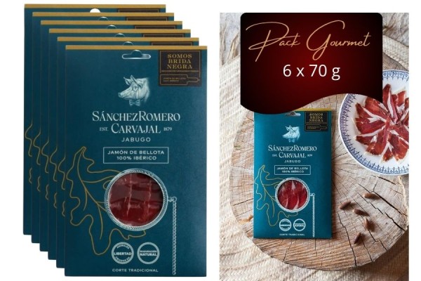L’Épaule Tranchée Sánchez Romero Carvajal est une véritable délicatesse, en fines tranches infiltrées, coupées au couteau et conditionnées sous vide. Pata Negra de Jabugo, 100% Ibérica Bellota, disponible en packs de 70 g (6, 12 ou 24 sachets), prête à déguster.