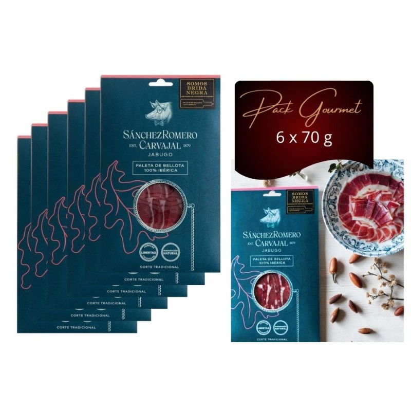 L’Épaule Tranchée Sánchez Romero Carvajal est une véritable délicatesse, en fines tranches infiltrées, coupées au couteau et conditionnées sous vide. Pata Negra de Jabugo, 100% Ibérica Bellota, disponible en packs de 70 g (6, 12 ou 24 sachets), prête à déguster.