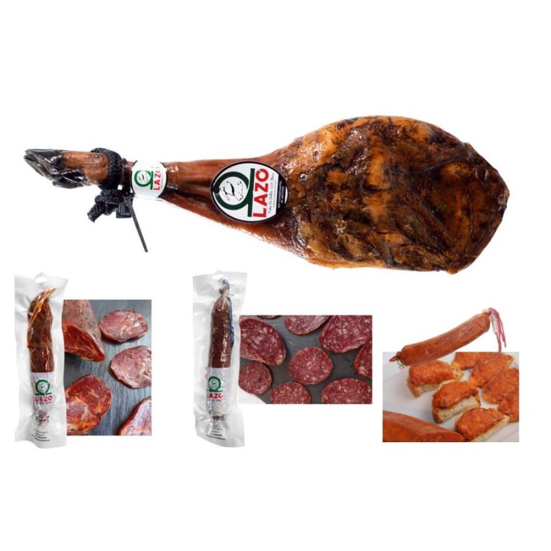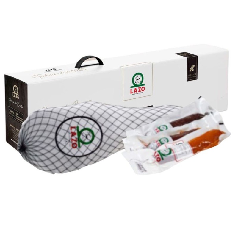Lot Ibérique Épaule Pata Negra 100% et Charcuteries Bellota LAZO. Découvrez notre coffret exclusif de 4 pièces gourmandes, incluant l'Épaule Bellota 100% Ibérique et une sélection inégalable de charcuteries. Nous avons sélectionné des pièces exquises comme le **Salchichón et Chorizo de Presa de Bellota**, ainsi qu'une authentique sobrasada ibérique. Un lot de pureté maximale, présenté dans un élégant étui cadeau.